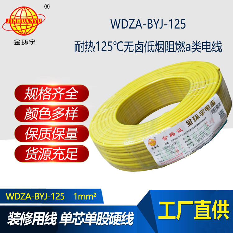 WDZA-BYJ-125全稱為耐熱125℃無鹵低煙阻燃A類交聯聚烯烴絕緣電纜;符合解釋說明:WDZ表示低煙無鹵阻燃;A代表A類阻燃;B代表布電線;YJ表示交聯聚乙烯;