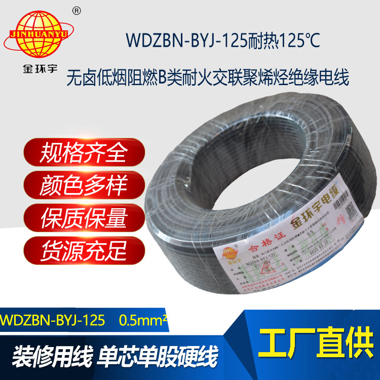 WDZBN-BYJ-125:即為低煙無鹵阻燃B類耐火電線,是指電線的絕緣層材料鹵素物質(zhì),在燃燒的情況下,不釋放含鹵氣體,煙霧濃度低,參照標(biāo)準(zhǔn)為JB/T 10491-2004,型號(hào)有WDZAN-BYJ-125、WDZBN-BYJ-125、WDZCN-BYJ-125等,