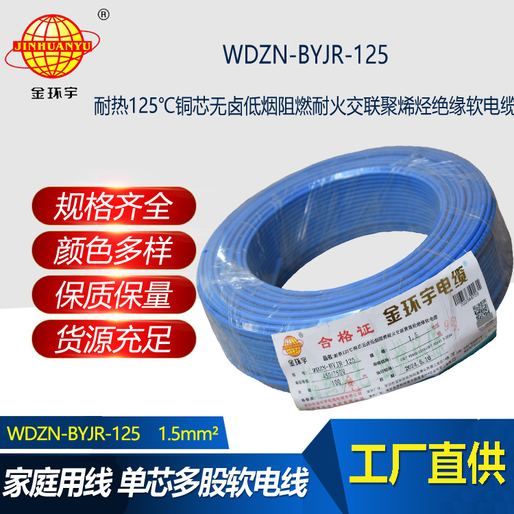 WDZN-BYJR-125是一種交聯(lián)聚乙烯新型裝修的布電線。WDZN-BYJR-125布電線的特點(diǎn)就是低煙量、無鹵素、阻燃、耐火。每個(gè)字母代表的意思:W代表無鹵;D代表低煙;Z代表阻燃;N代表耐火;125代表溫度可達(dá)到125℃,YJ代表交聯(lián)聚乙烯絕緣;R代表軟。其導(dǎo)體主要是銅線,有薄的絕緣層和良好的電氣機(jī)械性能,以及耐熱、防潮、耐溶劑等性能,選用不同的絕緣材料可獲得不同的特性。